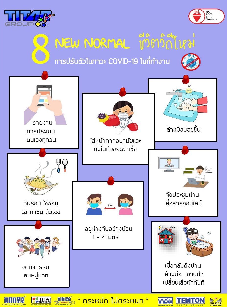 เนื่องจากในปัจุบัน ประเทศไทยยังคงเผชิญกับวิกฤตโรคระบาด Covid-19 ทางไทแทน กรุ๊บ และบริษัท ไทแทน เครน จึงขอเป็นอีกหนึ่งกำลังในการประชาสัมพันธ์ข้อมูลเกี่ยวกับการป้องกันตัวจากโรคระบาด บนหัวข้อความปลอดภัยในการทำงานครับ ซึ่งในเดือนนี้เราขออนุญาตนำเสนอ 8 New normal ชีวิตวิีใหม่ การปรับตัวในภาวะ Covid-19 ในที่ทำงาน มาให้ทุกท่านได้อ่านและทำความเข้าใจ และทางไทแทน กรุ๊ปหวังว่าข้อมูลที่เรานำมาเผยแพร่จะเป็นประโยชน์ต่อผู้เข้าชมทุกท่านไม่มากก็น้อยครับ