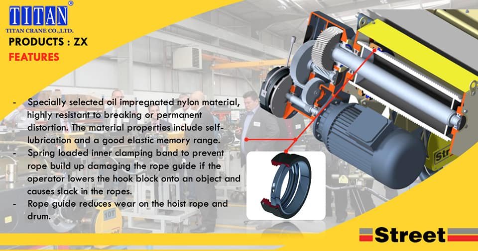 - อันดับแรกที่ไม่พูดถึงไม่ได้ Rope guide ทำมาจาก Oil impregnated nylon ซึ่งมีคุณสมบัติอ่อนกว่าลวดสลิง ช่วยลดการเสียดสี และช่วยเพิ่มการหล่อลื่นตัวลวดสลิง